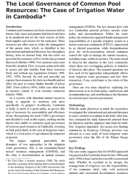 In the 1980s and 1990s a large number of NGOs emerged in Cambodia, primarily in response to donors’ agendas on strengthening civil society to curb repressive developing country governments and support a broad democratisation process. Over the last 20 years, donor money has been concentrated on funding a small group of NGOs, mostly located in the country’s centre. While it is not argued that NGOs h...