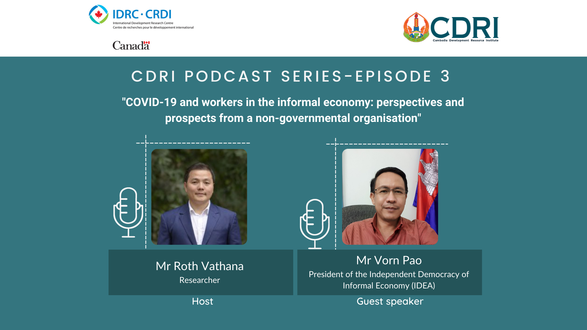 Our host, Mr Roth Vathana sat with Mr Vorn Pao, President of the Independent Democracy of Informal Economy (IDEA), to discuss the challenges and needs of informal workers during COVID-19, interventions that IDEA and the government have implemented to mitigate negative shocks of the pandemic on workers in the informal economy.