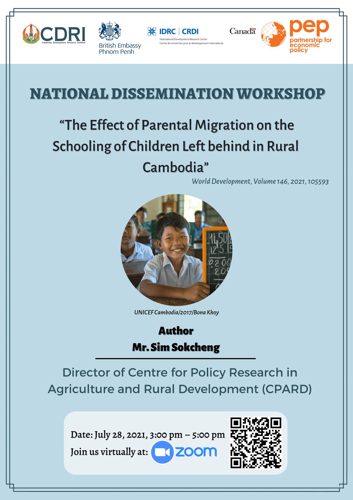 Sponsored by Partnership for Economic Policy (PEP), CDRI is hosting a National Dissemination Workshop on “The Effect of Parental Migration on the Schooling of Children left behind in Rural Cambodia”