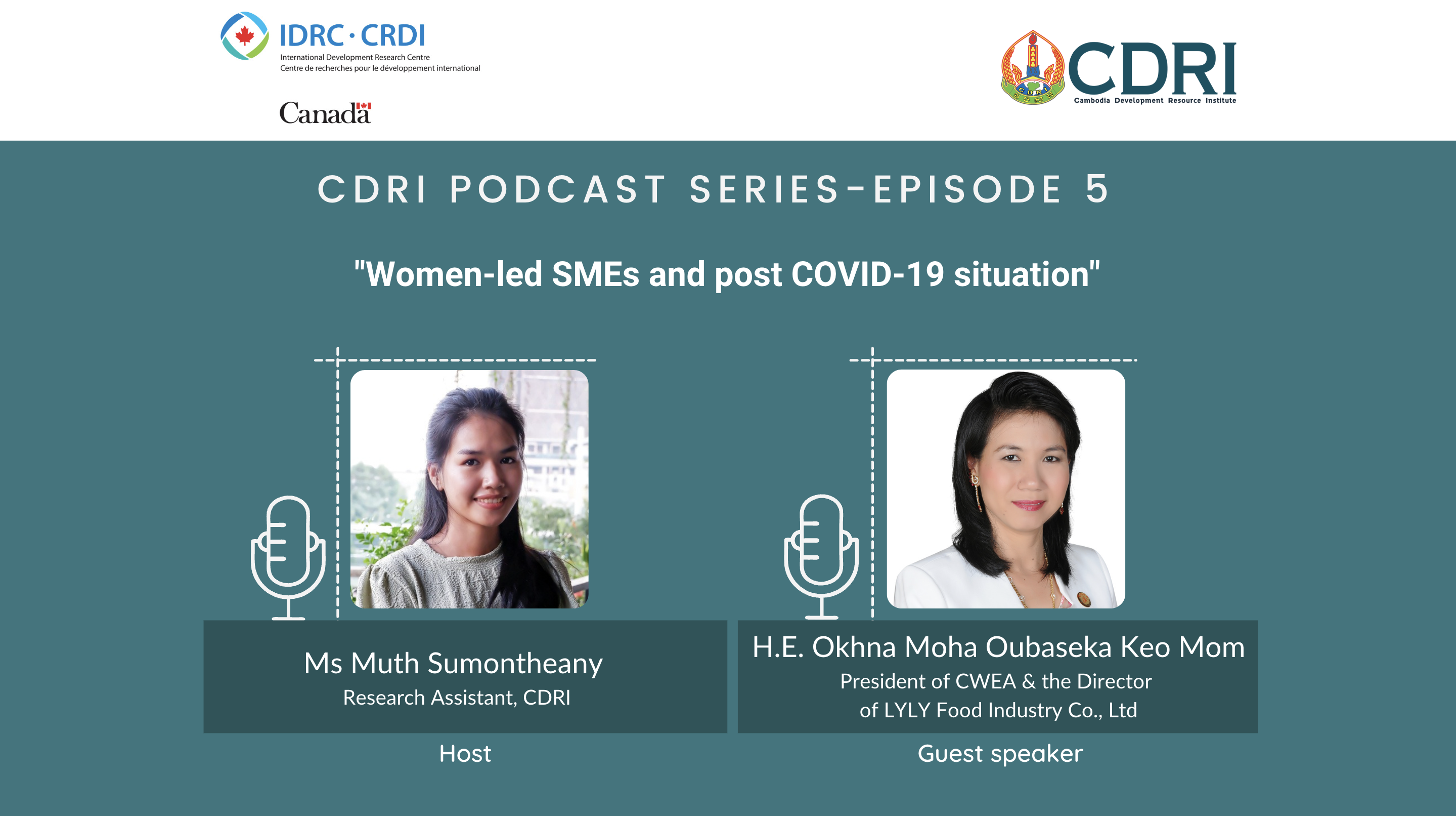 As part of a regional project on “Impacts of COVID-19 on Inclusive Development and Governance: Rapid and Post-Pandemic Assessment in the CLMV", the Cambodia Development Resource Institute (CDRI) is pleased to present CDRI Podcast Series Episode 5 on “Women-led SMEs and post-COVID-19 situation”. Our host, Ms. Muth Sumontheany, Research Assistant of CDRI conversed with H.E. Okhna Moha Oubaseka Keo Mom, the President of Cambodia Women Entrepreneurs Association and founder of LYLY Food Industry Co., Ltd on the status, challenges, and solutions for women-led SMEs in the post-COVID-19 situation in Cambodia.