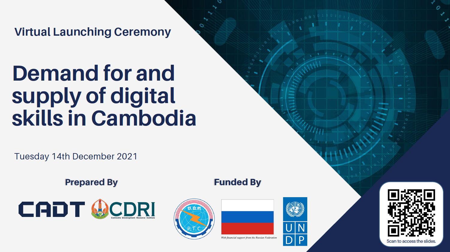 On the morning of 14th December 2021, Our researchers from the Centre of Economic Development and Trade and Centre for Educational Research and Innovation have delivered a presentation in the official launch of the report on “Demand for and Supply of Digital Skills in Cambodia”. Under cooperation with Cambodia Academy of Digital Technology (CADT) and financially supported by the Ministry of Post and Telecommunication, the Russian Federations and UNDP Cambodia, Cambodia Development Resource Institute has implemented a research project to assess the demand and supply of ICT and digital skills. The project started in 2020 and ended in mid-2021. Findings from the firms and graduate survey, and key informant interviews with representatives from relevant institutions, associations and development partners are documented in the report, which provides important inputs for the formulation of policy supporting digital skill development in Cambodia. The slide presentation can be accessed by scanning the QR Code attached to the poster above and to view the report, please visit this link: https://www.cadt.edu.kh/resources/digital-skills-assessment-event-2021/demand-for-and-supply-of-digital-skills-in-cambodia-2021/