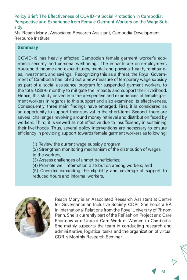 COVID-19 has heavily affected Cambodian female garment workers’ economic security and personal well-being. The impacts are on employment, household income and expenditures, mental and physical health, remittances, investment, and savings. Recognizing this as a threat, the Royal Government of Cambodia has rolled out a new measure of temporary wage subsidy as part of a social assistance program for suspended garment workers, to a total of US$70 monthly to mitigate the impacts and support their livelihood. Hence, this study delved into the perspective and experiences of female garment workers in regards to this support and also examined its effectiveness. Consequently, three main findings have emerged. First, it is considered as an opportunity to support their survival in the short term. Second, there are several challenges revolving around money retrieval and distribution faced by workers. Third, it is viewed as not effective due to insufficiency in sustaining their livelihoods. Thus, several policy interventions are necessary to ensure efficiency in providing support towards female garment workers as follows: