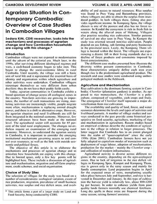 Agrarian Situation in Contemporary Cambodia: Overview of Case Studies in Cambodian Villages