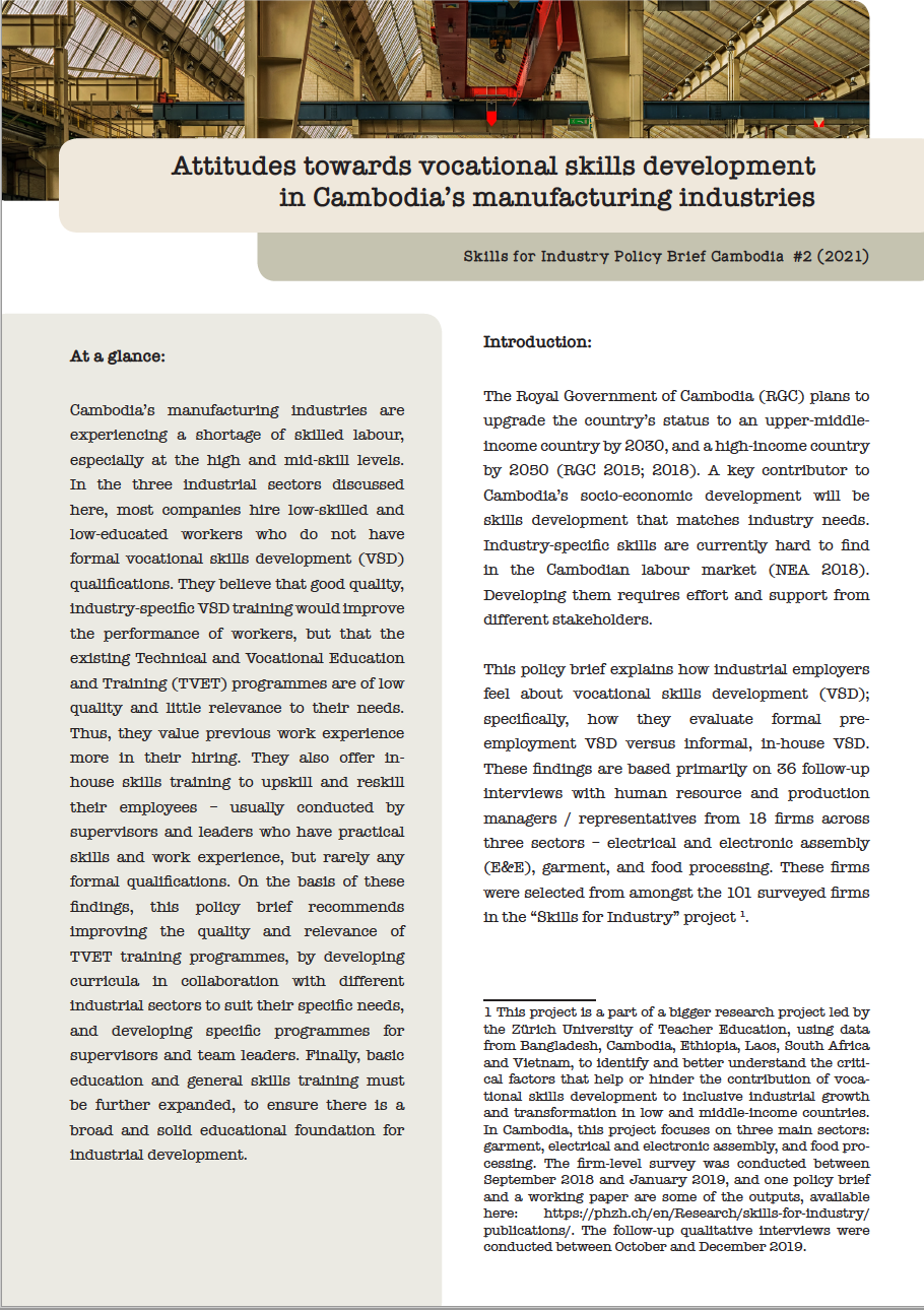 Cambodia’s manufacturing industries are experiencing a shortage of skilled labour, especially at the high and mid-skill levels. In the three industrial sectors discussed here, most companies hire low-skilled and low-educated workers who do not have formal vocational skills development (VSD) qualifications. They believe that good quality, industry-specific VSD training would improve the performance of workers, but that the existing Technical and Vocational Education and Training (TVET) programmes are of low quality and little relevance to their needs. Thus, they value previous work experience more in their hiring. They also offer in-house skills training to upskill and reskill their employees – usually conducted by supervisors and leaders who have practical skills and work experience, but rarely any formal qualifications. On the basis of these findings, this policy brief recommends improving the quality and relevance of TVET training programmes, by developing curricula in collaboration with different industrial sectors to suit their specific needs, and developing specific programmes for supervisors and team leaders. Finally, basic education and general skills training must be further expanded, to ensure there is a broad and solid educational foundation for industrial development.