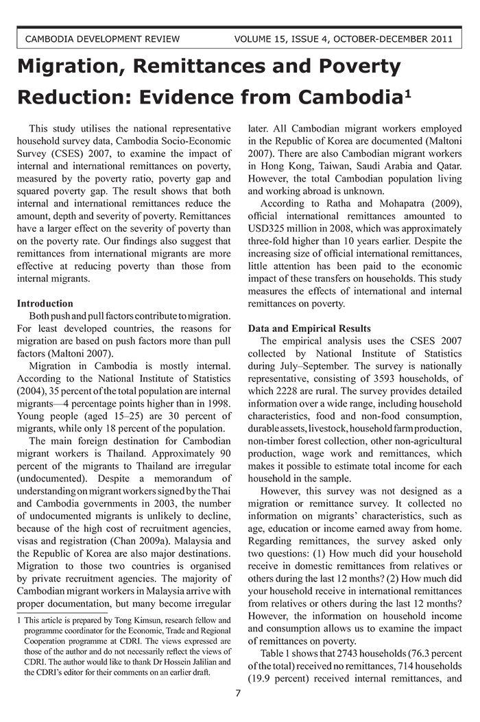 Migration, Remittances and Poverty Reduction: Evidence from Cambodia