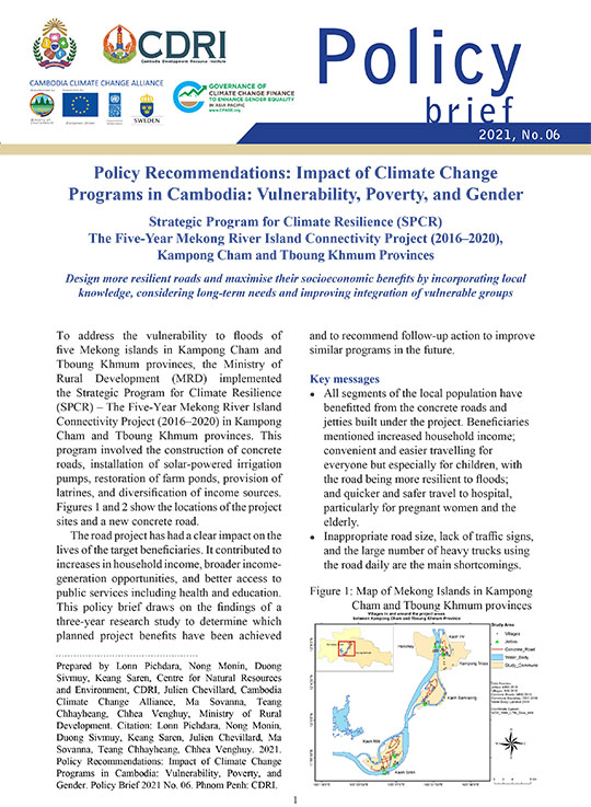 To address the vulnerability to floods of five Mekong islands in Kampong Cham and Tboung Khmum provinces, the Ministry of Rural Development (MRD) implemented the Strategic Program for Climate Resilience (SPCR) – The Five-Year Mekong River Island Connectivity Project (2016–2020) in Kampong Cham and Tboung Khmum provinces. This program involved the construction of concrete roads, installation of solar-powered irrigation pumps, restoration of farm ponds, provision of latrines, and diversification of income sources. Figures 1 and 2 show the locations of the project sites and a new concrete road. The road project has had a clear impact on the lives of the target beneficiaries. It contributed to increases in household income, broader income-generation opportunities, and better access to public services including health and education. This policy brief draws on the findings of a three-year research study to determine which planned project benefits have been achieved and to recommend follow-up action to improve similar programs in the future.