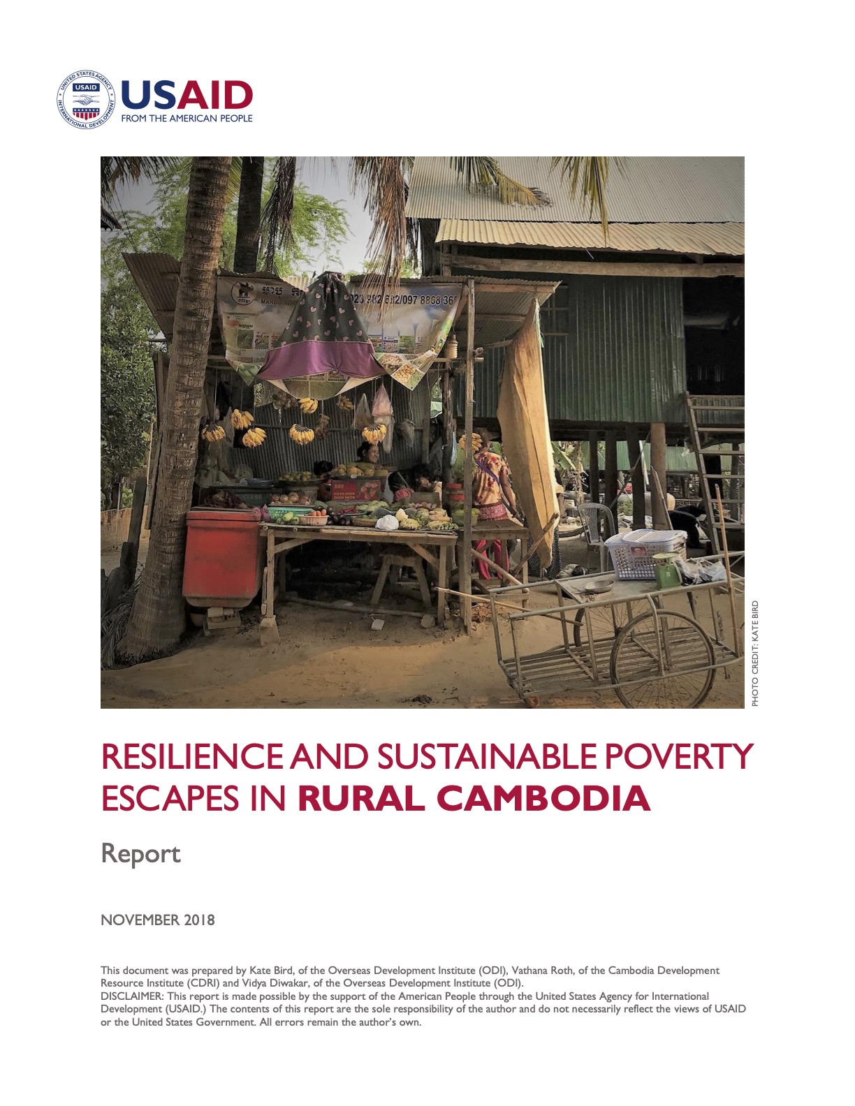The focus of this report is on household poverty escapes and what explains why some households escape poverty and remain out of poverty (sustainable poverty escape, or resilience), while other households escape poverty only to fall back into poverty (transitory poverty escape) and still other descend into poverty for the first time (impoverishment). Analysis of four rounds of the panel Agriculture, Rural Development and Poverty Reduction Survey in Cambodia spanning 2008-2017 for this case study reveals that just under one-fifth of households escaped poverty sustainably, while almost the same share (20%) escaped only to fall back in, or became impoverished for the first time, over the study period. There is considerable dynamism in rural household’s poverty status with almost 4 in 5 households living in poverty during at least one of the 2008-17 survey years.
