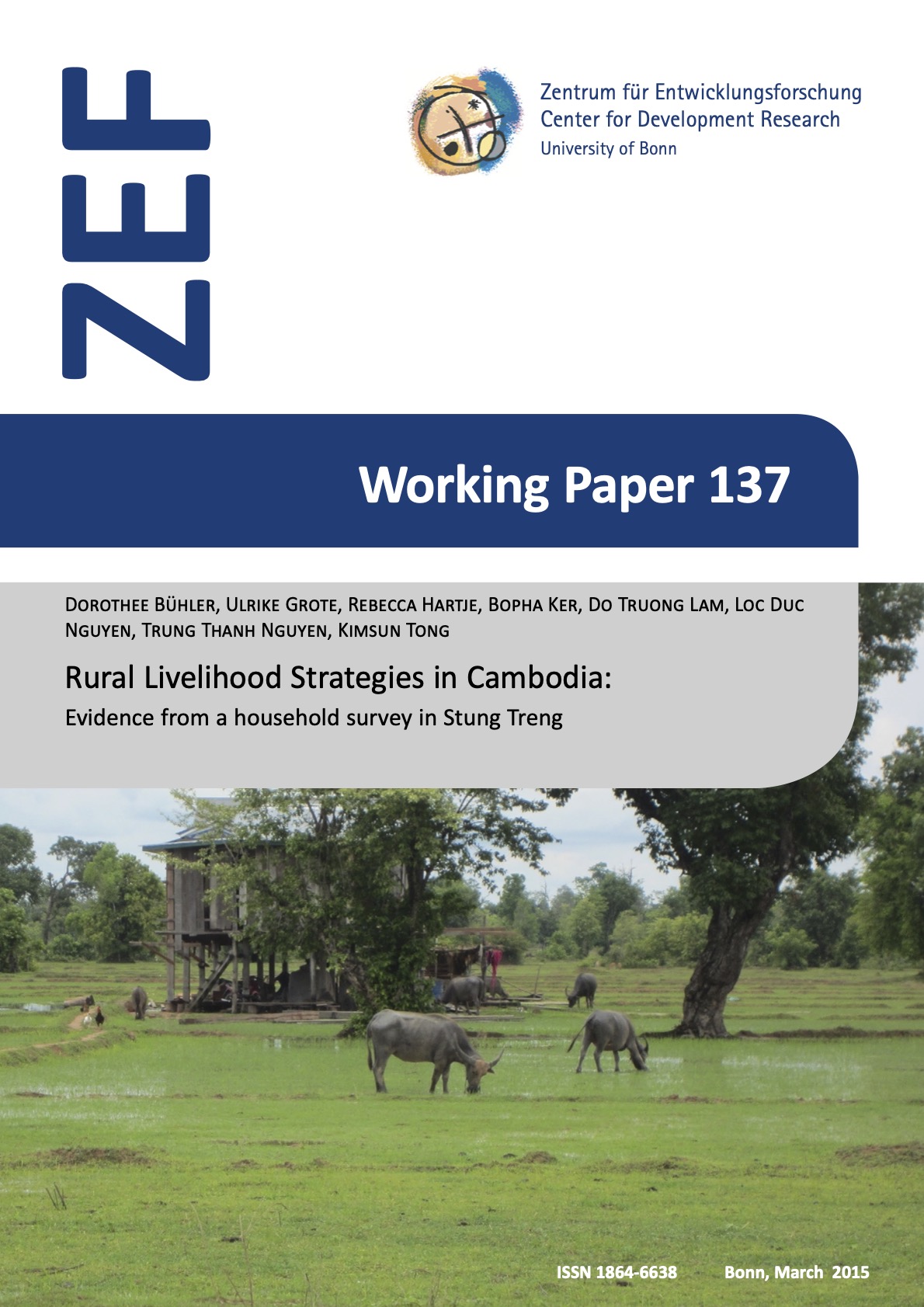 The overall objective of this discussion paper is to advance the knowledge on rural livelihoods in Stung Treng, Cambodia. In a cluster analysis, five clusters with very different livelihood strategies are identified based on a sample of 600 rural households. Despite the fact that nearly all households are engaged in some form of subsistence farming, especially by growing rice, the richer clusters build on self-employment and higher-skilled wage employment. In contrast the middle income cluster mainly depends on natural resources (fish and firewood). The poorer two clusters are engaged in lower- skilled wage employment. The incidence of poverty is widespread but differences between the clusters are clearly visible. Even the better-off households have consumption poverty headcount ratios of between 37 to 50% at PPP $1.25. For households from the poorest clusters the poverty headcount ratio amounts to even 70% for income and 80% for consumption. Especially the households largely depending on natural resource extraction are characterized by a high incidence of poverty and high vulnerability. In addition, there are a number of pressures which are expected to increase poverty problems in the future. Policies aimed at reducing poverty and improving rural livelihoods need to carefully consider the close linkages between rural livelihoods and natural resources. But also a diversification away from natural resource extraction into higher-skilled jobs is found to be a strategy opening up new opportunities to improve livelihood security and raise the living standards of the poor.