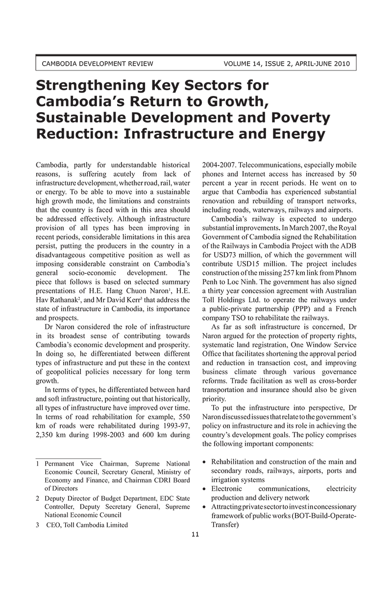 Strengthening Key Sectors for Cambodia’s Return to Growth, Sustainable Development and Poverty Reduction: Infrastructure and Energy