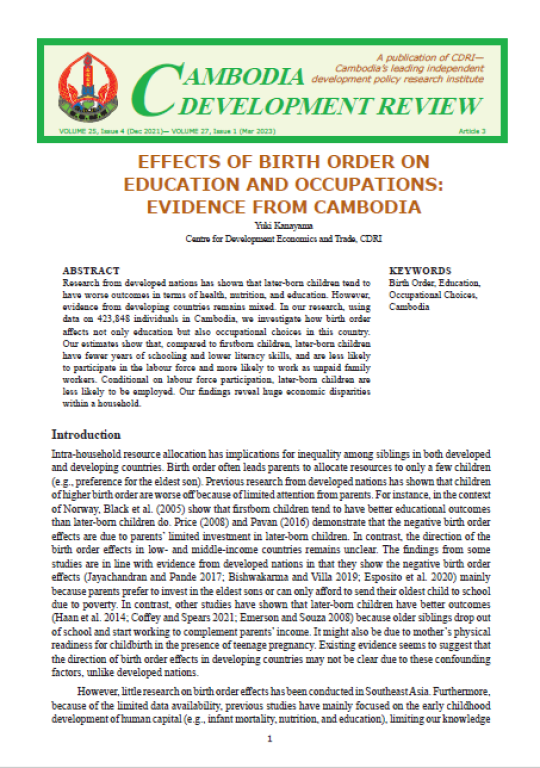 data on 423,848 individuals in Cambodia, we investigate how birth order
