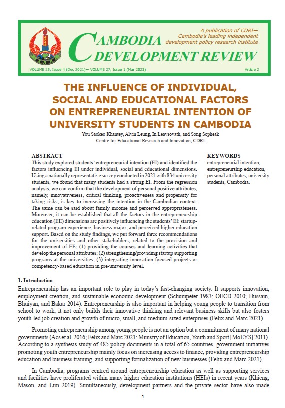Keyword: entrepreneurial intention, entrepreneurship education, personal attributes, university students, Cambodia