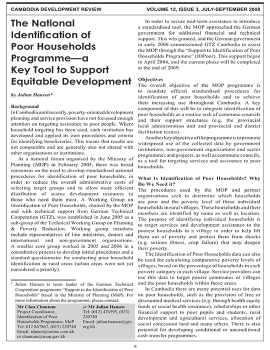 The rising fuel and food prices Cambodia experienced in 2008 pushed year on year inflation above 20 percent in March – August. Although high food prices negatively affect everyone, they impact more severely on the poor, especially net food buyers. In Cambodia, the poorest 40 percent of the population spend 70 percent of their income on food. Most o...