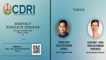 CDRI is hosting our virtual monthly research seminar on Thursday, March 25, 2021, at 3:00 -4:30PM (Phnom Penh time) via Zoom. By topic: Research Skills (qualitative methods), by Dr Sokphea YoungClean Energy – Global Trends and Cambodian Opportunities, by Mrs Bridget McIntosh