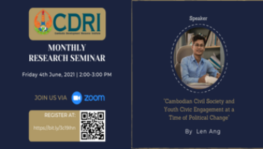 CDRI is hosting our virtual Monthly Research Seminar under the topic "Cambodian Civil Society and Youth Civic Engagement at a Time of Political Change" by Len Ang on Friday, June 4, 2021, from 2:00-3:00 PM (Phnom Penh time) via Zoom.