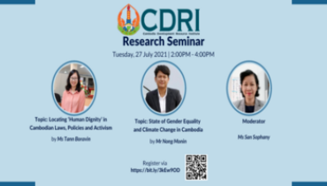 CDRI is hosting our virtual monthly research seminar on Tuesday, 27 July 2021 from 2:00 PM - 4:00 PM (Phnom Penh time) via Zoom. Two speakers will give presentations on the following topics:Locating ‘Human Dignity in Cambodian Laws, Policies and Activism, by Ms Tann BoravinState of Gender Equality and Climate Change in Cambodia, by Mr Nong MoninPlease access this link for your registration: