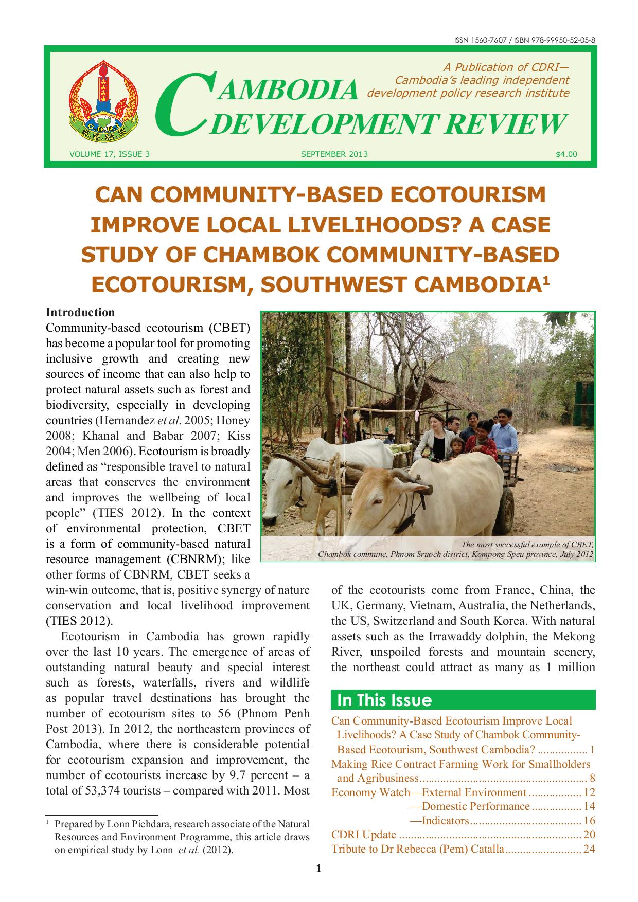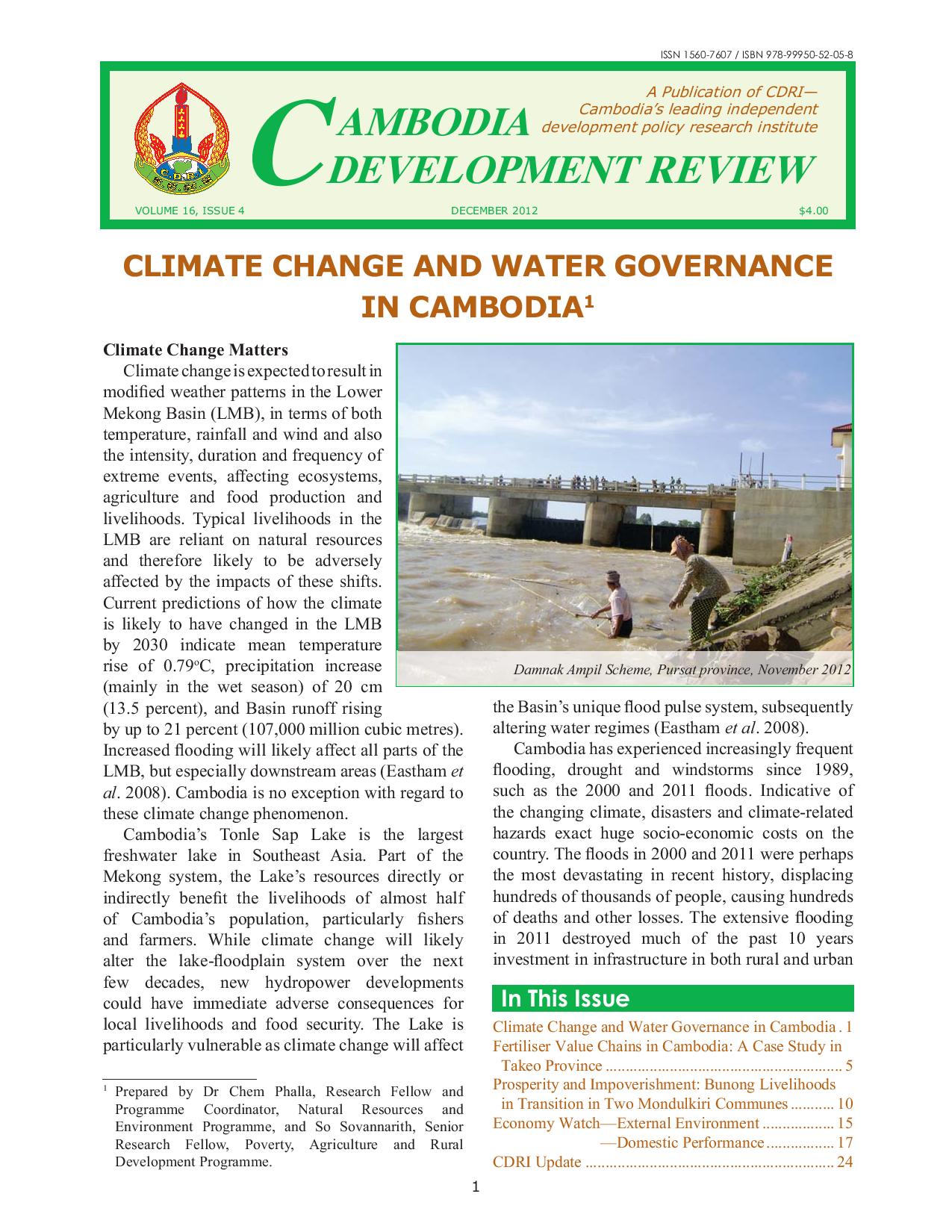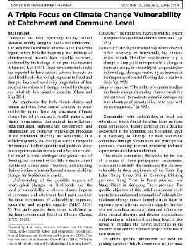 Cambodia is divided into four agro-ecological zones—the Tonle Sap plain, Mekong plain, mountains/plateau and coast—representing heterogeneous agricultural activity, population and livelihood systems (UNDP 2011b). Climate change impacts and the adaptive capacity of the people differ from one zone to another. Adaptation measures have varied according to the sector and the locality, adaptive capacity...