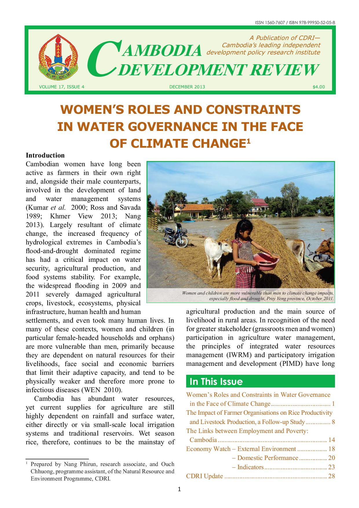 Addressing gender issues is essential in promoting and advancing the role and economic, social, political, legal and cultural status of women. The need to address this concern has been increasingly acknowledged by the government of Cambodia since it would help to improve and sustain not only family economy but also national development and economic growth (UN Women 1995) (RGC 2010). In its th...